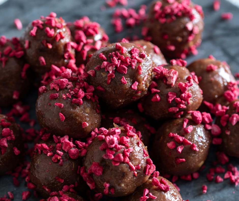 Ābolu enerģijas bumbiņas Sastāvdaļas: Dateles (bez kauliņiem) – 150 g Auzu pārslas – 50 g Liofilizēti āboli – 1 sauja Rieksti (mandeles vai lazdu) – 50 g Kanēlis vai vaniļa – šķipsniņa Pagatavošana: Liofilizētos ābolus, dateles un riekstus sablendē kopā ar auzu pārslām. Masu sajauc, pievieno kanēli, veido mazas bumbiņas un apviļā šokolādē un ja vēlies- liofilizētu aveņu pulverī. Atstāj ledusskapī 30 minūtes un bauda.